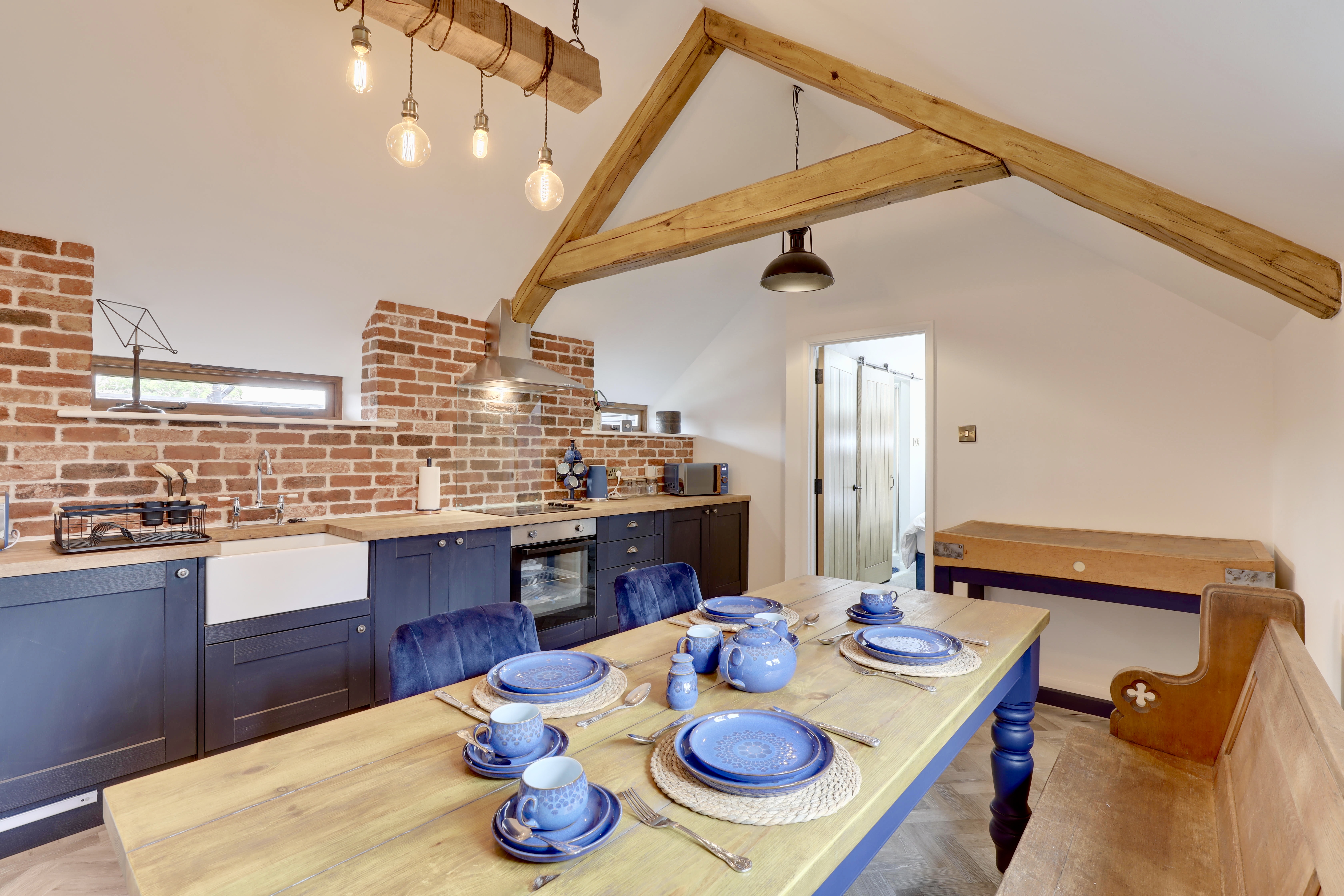 A quirky contemporary kitchen with a mix of old and new wonderfully brought together to give a feel of loft living, includes built-in undercounter fridge with freezer compartment (with ice trays) single oven, halogen hob and Dulce Gusto Coffee machine (please bring your own coffee pods), microwave, 4 slice toaster and kettle...fully equipped to accommodate four guests with dining table and church pew seating. You should find all the usual cooking paraphernalia you should require for your stay.
